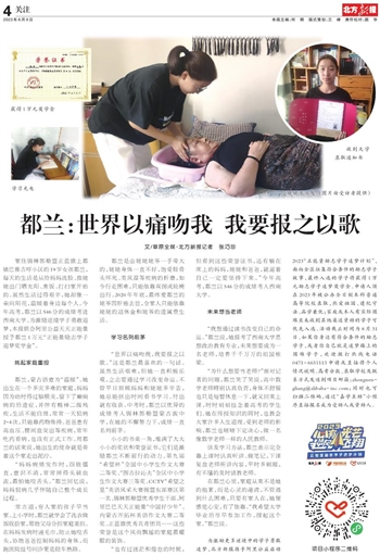 在都兰心里,家庭从来不是她的拖累,而是心灵的港湾,不管遇到什么困难,只要有家人在,她便感觉心安,有了依靠。“我希望大学毕业后尽早参加工作,撑起这个家。”都兰说。