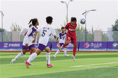 10日上午,足球项目女子丙组比赛打响。4支队伍参赛,采用单循环赛制,最终根据积分决出前两名。首场比赛在呼和浩特市代表队和通辽市代表队之间展开。只见运动场上,双方队员来回奔跑,传接球、抢断、射门、扑救……比赛高潮迭起,扣人心弦。