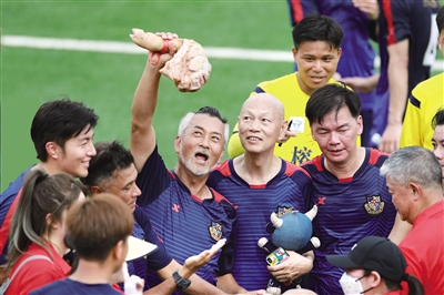 8月13日,香港明星队球员举起作为比赛奖品的猪蹄。最终香港明星队以4:3战胜榕江村民队。
