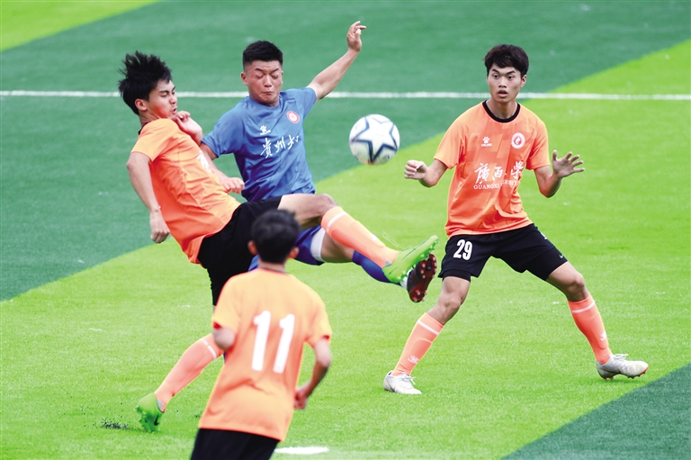 8月13日,贵州大学生态茶队球员与广西大学甘蔗汁队球员在比赛中拼抢。