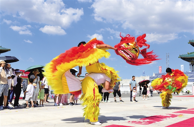 8月13日,在鄂尔多斯文化产业园景区,民间艺人表演舞狮。当日,为期15天的伊金霍洛旗2023首届九州非遗绝技文化旅游节暨非遗旅游嘉年华在鄂尔多斯文化产业园景区开幕。来自全国各地的民间艺人为游客表演舞狮、高跷、木偶戏等特色节目,展现非遗文化和民间艺术的魅力。摄影/王 正