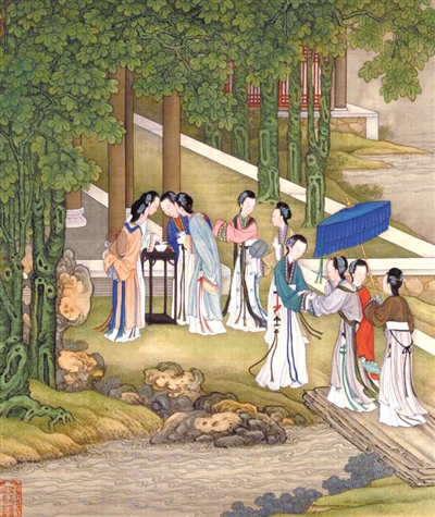 “穿针乞巧”,也叫“赛巧”,即女子比赛穿针,她们结彩线,穿七孔针,穿得越快,就意味着乞巧越多,慢者则称为“输巧”。五代王仁裕撰《开元天宝遗事》中云:“七夕,宫中以锦结成楼殿,高百尺,上可以胜数十人,陈以瓜果酒炙,设坐具,以祀牛、女二星,妃嫔各以九孔针、五色线向月穿之,过者为得巧之候。动清商之曲,宴乐达旦。土民之家皆效之。”