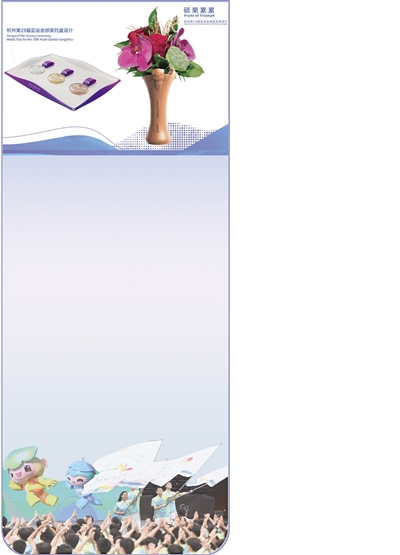 本届亚运会颁奖花束的一大创新是增加了花器的使用,其造型灵感来自中国南宋时期的官窑花觚,由国家级非物质文化遗产东阳木雕制作而成。瓶口起伏的水纹展现浙江山水的韵律之美,瓶口的吉祥物造型以活泼欢快的姿态庆祝运动员勇创佳绩、收获胜利。花器可供各位获奖运动员永久保存。