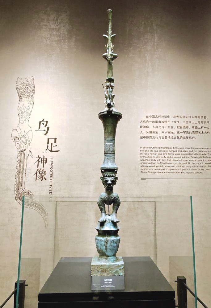 三星堆博物馆新馆二楼,专为青铜鸟足神像辟出展陈单元,参观者莫不啧啧称奇。凸目獠牙、人鸟合体。这尊神像,上着交领锦衣,下穿云雷纹紧身短裙,双足似鸟爪突出。它头顶朱砂彩绘觚形尊,手撑方座罍,身体向后翻起,踏在一对怪鸟之上;一位头戴高冠、缀象牙耳饰、握凤首龙尾法器的“祭司”立于觚形尊之上,脚下卧着一条威风凛凛的龙……神像形态之复杂、内涵之丰富,彰显了三星堆先民浪漫的想象力和非凡的创造力,是中国青铜文明史上独一无二的存在。