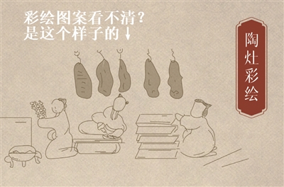 图中陶灶彩绘上的三位女厨,一位正在烤肉串,一位在切肉块,另一位正往扦子上穿肉。三人分工明确、全神贯注。