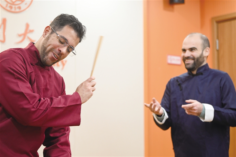 12月6日,吴瑞龙(左)和墨麒麟(右)排练相声。一把折扇、两袭长衫,辅以略显夸张的肢体动作和表情……在南开大学外国语学院的教室里,两位“老外”用西班牙语说起相声,并依托学校平台对外传播。这对搭档中负责逗哏的是来自委内瑞拉的吴瑞龙,捧哏的是西班牙人墨麒麟,都是学院西班牙语系的外籍教师。他俩将中式幽默转化为西班牙语境下的习惯表达,让学生体会两种语境下不同的诙谐幽默,从而更好掌握西班牙语。吴瑞龙和墨麒麟表示,在相声创作和表演中让更多外国人感受中华优秀传统文化的魅力。摄影/新华社记者 李 然