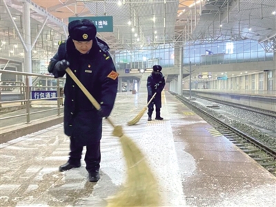 呼和浩特火车站启动了恶劣天气应急预案Ⅲ级应急响应命令,对车站专用通道、站前广场、出站口处积雪进行疏通清扫。车站指挥中心密切关注行车设备设施运行状态,保障旅客安全出行。