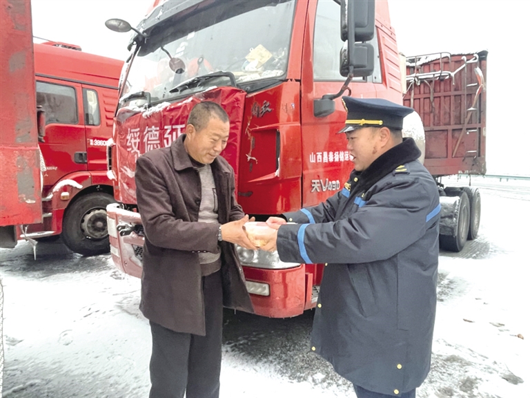 受交通管制影响,10日夜间,大量货车滞留在收费站广场。11日,鄂尔多斯市收费公路服务中心各收费所的职工们天不亮就忙碌起来,做面条、蒸包子、熬粥、烧水,让滞留人员在冰天雪地中吃上热乎饭,感受到浓浓暖意。