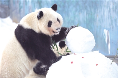 吕艳桃说,大熊猫馆设有室内、室外两个活动场所,“七巧”和“七喜”虽然怕热不怕冷,但大雪过后气温骤降,它们大部分时间就待在室内场馆活动。天气稍暖时,也会到室外玩耍。饲养员用积雪在室外场馆堆起了“雪熊”,里面藏有苹果,供“七巧”和“七喜”寻宝。