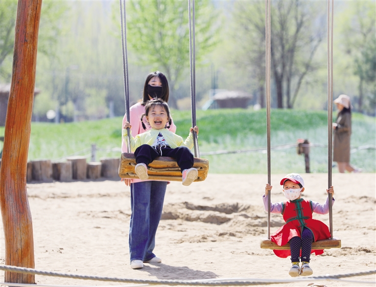 4月17日,两个小朋友在小草公园快乐玩耍。随着天气回暖,呼和浩特市各大公园花朵绽放、小草返青,前来休闲、运动、游玩的人明显增多。 摄影/草原全媒·北方新报首席记者 牛天甲