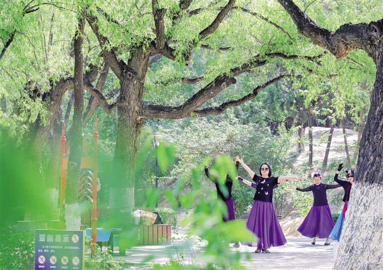 悠悠夏日长,何处觅清凉?6月3日,记者在呼和浩特市满都海公园看到,市民在绿树成荫的小道上漫步、跳舞,尽享夏日好时光。 摄影/草原云·北方新报首席 记者 牛天甲