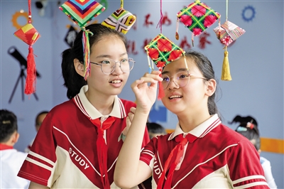6月4日,学生在欣赏制作完成的“七彩粽子”香囊。当日,呼和浩特市玉泉区恒昌店巷小学举行“多彩民俗迎端午 传统文化润童心”主题活动,学生们在老师的带领下体验制作“七彩粽子”香囊、编制五彩绳、赛旱地龙舟等民俗活动,在欢乐的氛围中感受传统文化的独特魅力,共同迎接端午节的到来。摄影/草原云·北方新报首席记者 牛天甲