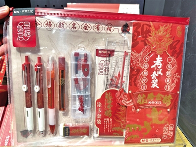 记者还发现,文具市场迎来热卖季,印着“金榜题名”“考试神器”“孔庙祈福”等吉祥祝福语的橡皮、笔袋及文具套装等摆在C位,受到考生和家长欢迎。