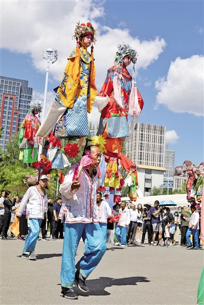 当日,内蒙古展览馆广场上人头攒动、热闹非凡,这里搭建舞台进行北疆非物质文化遗产展演,长调民歌、呼麦、格斯尔、江格尔、好来宝、二人台、赞达仁、脑阁、安代舞、鲁日格勒、俄罗斯民间舞蹈、太平鼓舞、马头琴音乐、四胡音乐等表演艺术类20余个非遗代表性项目150余位传承人,采取舞台展演、广场巡演等形式,进行串联展示,让市民在非遗视觉盛宴中感知北疆文化的魅力。