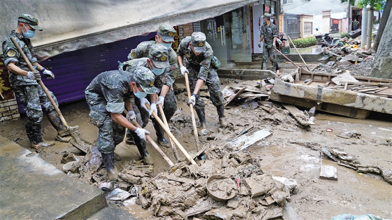 为了能让受灾群众早日恢复正常的生活,武警官兵们不怕脏不怕累,用自己的双手一铲铲、一车车,清理了90多吨的垃圾和淤泥。