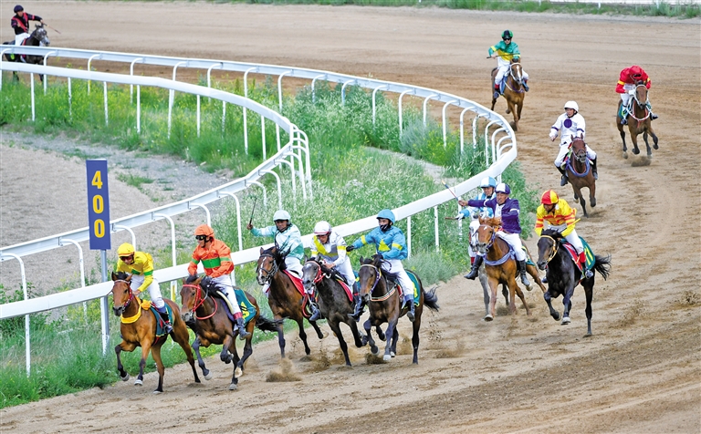 6月30日下午,选手们在比赛中你追我赶。当日,2024中国速度赛马积分赛暨内蒙古呼和浩特速度赛马常规赛第七赛马日,在内蒙古少数民族群众文化体育运动中心拉开战幕。当日共进行了六场比拼,包括五场纯血组速度赛马和一场成年组蒙古马长途赛事,共有56匹赛马激战敕勒川草原。