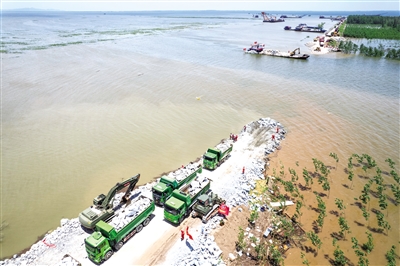 ●自团洲垸洞庭湖一线堤防决堤后,加固“第二道防线”的工作持续紧张进行。“第二道防线”是离决口约两公里处的钱团间堤,这是一道横亘在团洲垸和钱南垸之间、长约14.3公里的间堤。抢险队伍对间堤堤身堤脚清基扫障、铺设彩条布、巡堤查险,全力守住“第二道防线”。(据新华社报道)
