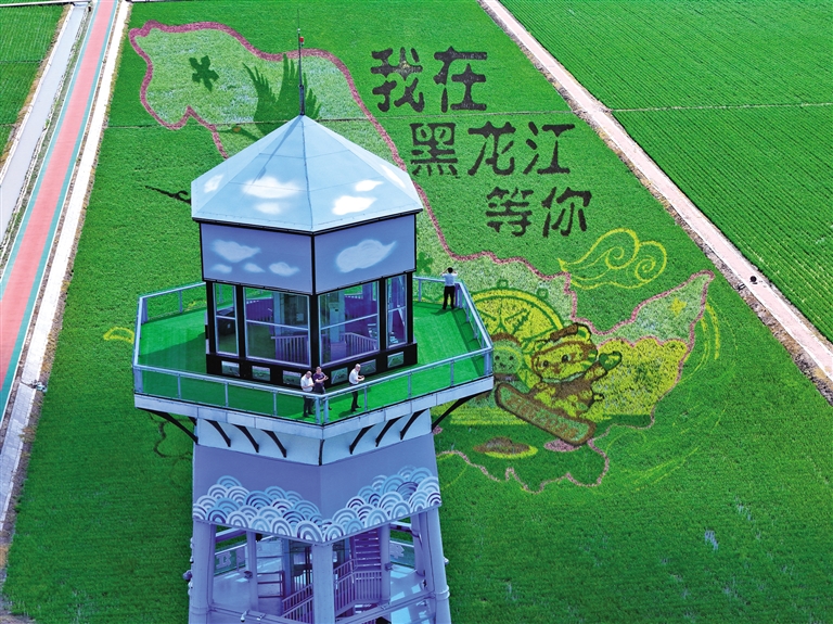 7月9日,游客在富锦市万亩水稻公园观光塔上欣赏稻田画(无人机照片)。在黑龙江省佳木斯富锦市万亩水稻公园,各种水稻“绘制”的稻田画日渐清晰,一幅壮美的稻田画卷正徐徐展开。(据新华社报道)
