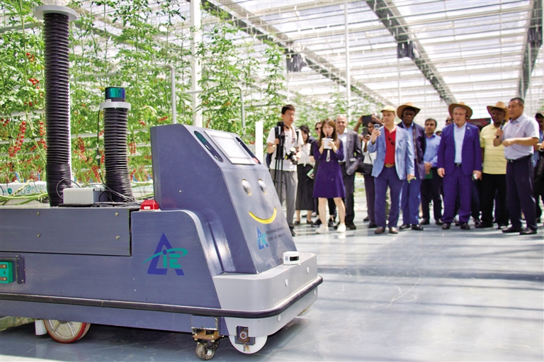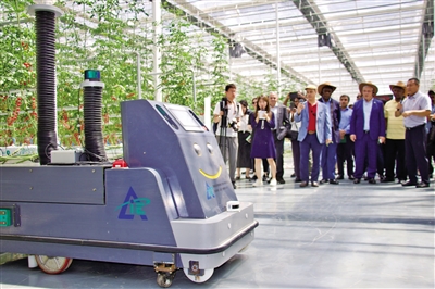 鄂尔多斯市达拉特旗德农现代高效设施农业产业园13000平方米的大棚内,全自动机器人在无土栽培的西红柿藤蔓间往来穿梭,高效完成巡检、采摘、施肥等各项工作。使节们边看边赞叹不已。