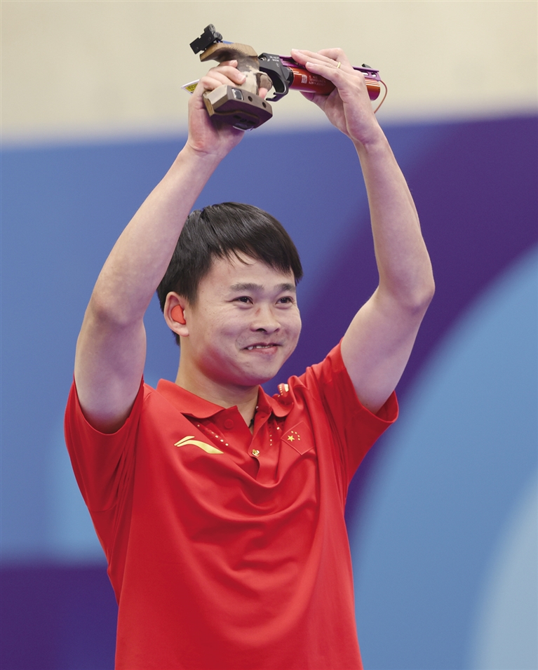 7月28日,谢瑜在赛后庆祝夺冠。当日,在法国沙托鲁举行的巴黎奥运会射击男子10米气手枪决赛中,中国选手谢瑜以总成绩240.9环成功夺得金牌,为中国代表团拿下第3金! (据新华社报道)