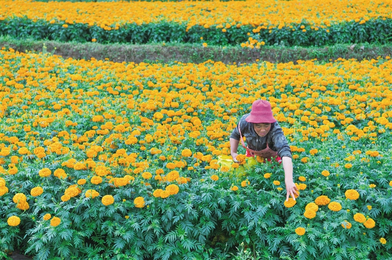 7月30日,村民在贵州省威宁县双龙镇高坡村采摘万寿菊。近日,贵州省威宁彝族回族苗族自治县种植的5000余亩万寿菊迎来盛花期,农户忙着采摘、搬运、出售万寿菊。当地种植合作社与制药企业达成“订单销售”协议,采取“公司+基地+农户”的模式发展万寿菊种植业,带动农户增收致富。摄影/新华社记者 杨文斌