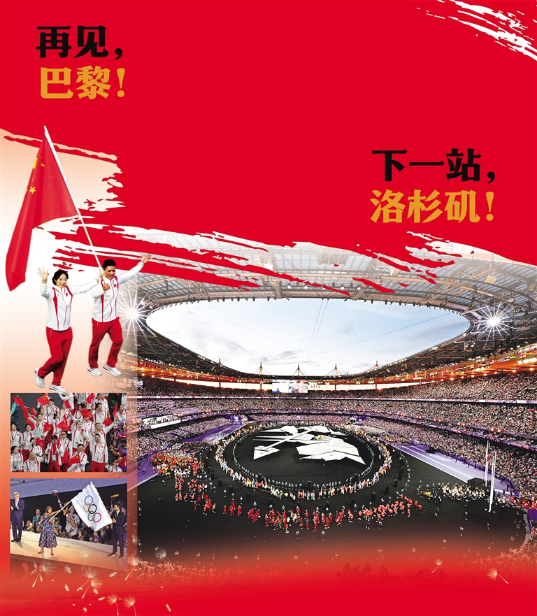 闭幕式上,观众们被带入了一场对未来世界天马行空的想象——金色旅行者从天而降,随着他的脚步,人们踏上一场梦幻般的探索。希腊国旗、奥运五环……与奥林匹克相关的遗迹逐渐被发掘。随着金色旅行者旅程结束,奥运五环在星光闪烁的背景下熠熠生辉。悠扬的乐曲声中,奥林匹克会旗缓缓降下。美国洛杉矶市市长从国际奥委会主席巴赫手中接过会旗,夏季奥运会跨越大西洋,进入“洛杉矶时间”。从海滩、山脉到电影梦工厂,以“我们的民众、城市、好莱坞、音乐、体育的未来”为主题的短片,带领观众穿行在这座充满活力、富有多元性的城市中。2028年,人们将见证新的体育偶像在洛杉矶诞生。(相关报道见4~5版)(据新华社报道)