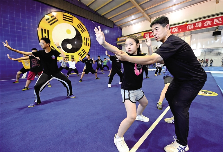 8月11日,八卦掌省级传承人任志刚(右)为学员讲解八卦掌动作要领。源自河北省文安县的八卦掌是国家级非物质文化遗产。暑假期间,文安县开办公益武术健身班,传授八卦掌技艺,吸引众多青少年前来学习。摄影/新华社记者 王 晓