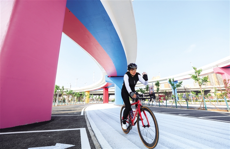 8月15日,一位骑行爱好者经过彩绘桥。当日,记者在呼和浩特市巴彦淖尔快速路与金海高架桥的互通桥下看到,桥墩和桥体表面被喷上红色、蓝色和黄色等鲜艳的颜色,与蓝天白云相映生辉,扮靓了城市一角。