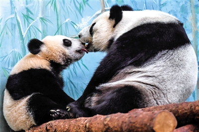 为庆祝“喀秋莎”的生日,莫斯科动物园精心准备了一个用竹叶和胡萝卜装饰的“竹蛋糕”,上面印有数字“1”,代表一周岁生日。在游客的欢呼声中,“喀秋莎”时而啃咬蛋糕上的竹子,时而翻滚在玩具堆中,憨态可掬的模样引得众人欢笑不断。(包诺敏 周天翮)