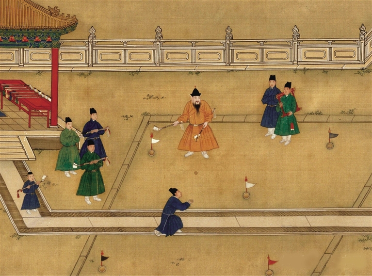 捶丸中用到的球和球杆也很有讲究。故宫博物院所藏的《明宣宗行乐图》有一部分描绘了明代捶丸运动的场景。捶丸的球杆有撺棒、杓棒、扑棒、单手、鹰嘴等十种,根据击球的姿势和距离远近不同,要换用不同的球杆。现在的高尔夫选手在比赛中需要用到木杆、铁杆、长杆、短杆辅助,比较起来,捶丸的讲究犹有过之。画中宣宗的球杆,一根根分门别类躺在特制的球台上,几位小太监一人捧着一根杆,等候主子换杆。帝王的球杆,通常以纯金打造边缘,顶上缀饰玉器,打球结束后,球具不装在球袋而收藏在锦盒中。