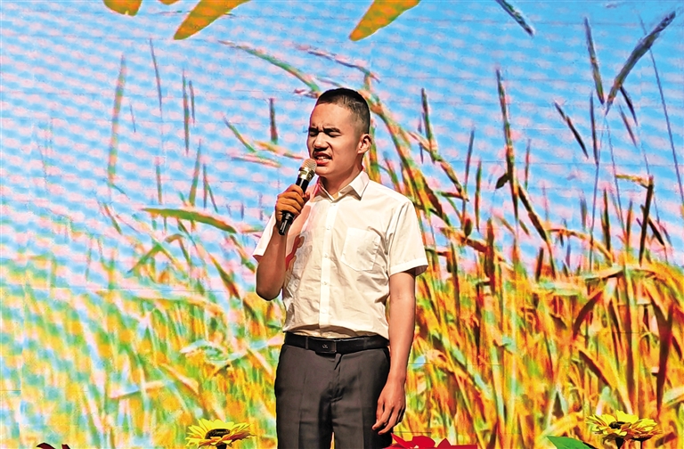 9月2日,在呼和浩特市开学第一课主题宣讲的舞台上,赵康深情朗诵了两篇作品,一篇是世界“杂交水稻之父”袁隆平先生写给母亲的一封信《稻子熟了》,一篇是《黄河》。朗诵完毕,全场响起热烈的掌声,观众都被这位情感充沛的盲人学生所感动和鼓舞。
