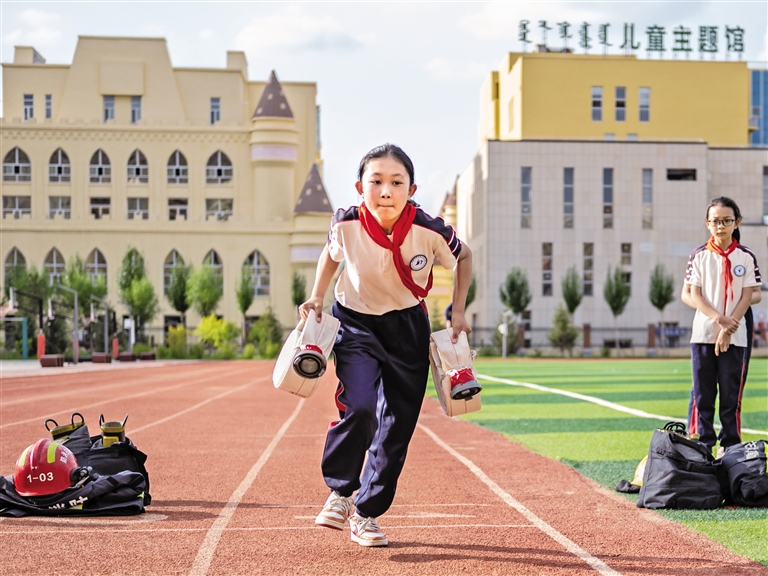 “预备,三二一开始……”随着响亮的哨音,两名学生手提消防水带冲出起跑线。9月3日,锡林郭勒盟消防救援支队联合盟教育局在锡林浩特市第十三小学开展“火焰蓝”牵手“红领巾”消防主题运动会,为全校师生送上别开生面的“开学第一课”,500余名师生参加此次活动。