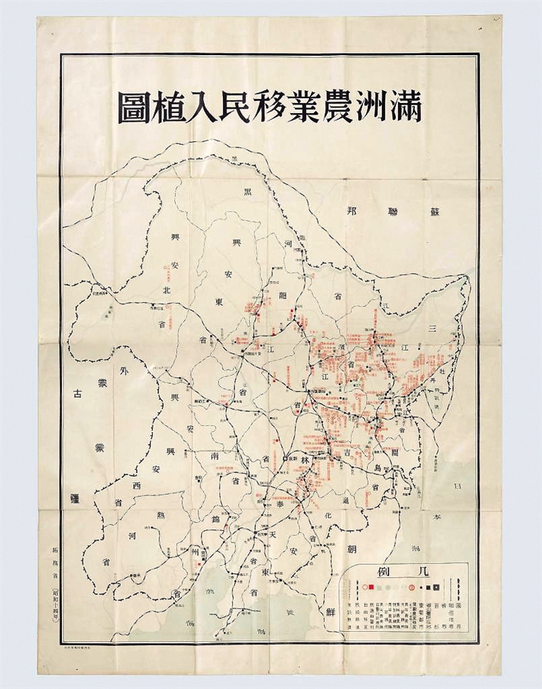 据介绍,1939年“满洲农业移民入植图”是日本昭和14年(1939年)由日本拓务省出版,日本杉田屋印刷所印刷,用100克凸版纸,呈红、黑、浅蓝三色,纵76厘米,横54厘米,保存完好。这是在1996年4月哈尔滨举行的近现代文物征集活动中,由民间人士捐赠,为东北烈士纪念馆收藏。