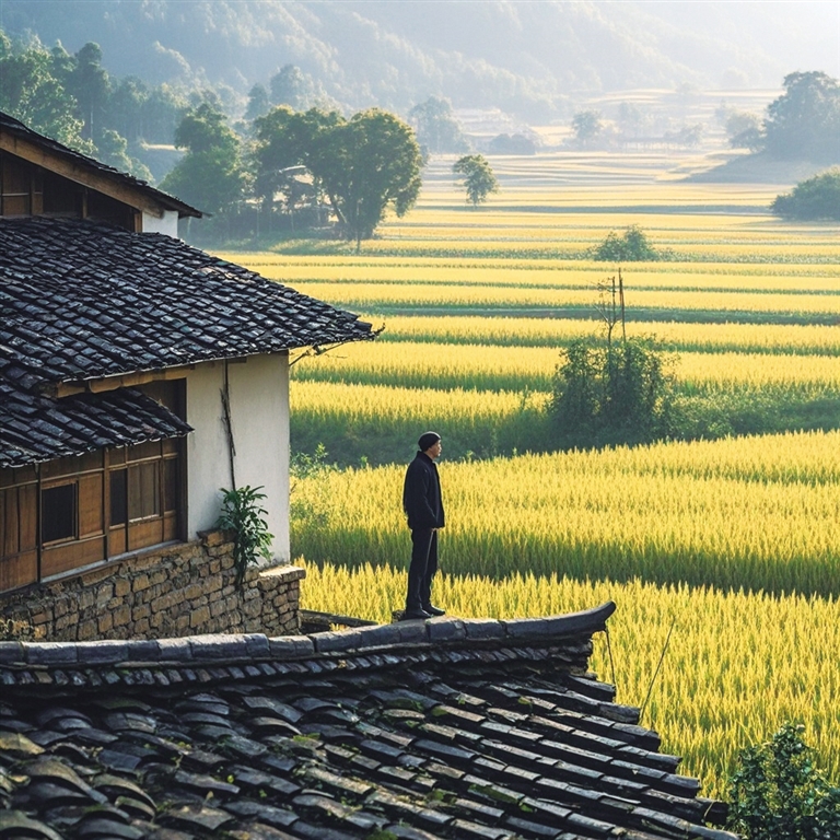 第二天早晨,我突发兴致,要求去梁老汉家的青瓦房顶上看看。梁老汉不明白我要干啥,不过还是听从了我的要求。他搬来梯子,我爬上屋顶,看见青瓦上有深深浅浅的青苔覆盖,瓦被浸透得如草一样的颜色。我突然产生一种冲动,坐在房顶上喝一碗老酒,微醺后,就把青瓦当床睡去。我蹲在房顶上,看见梁老汉家下面层层叠叠的金黄稻田,空气里弥漫着谷香,大地母腹临产前的喜悦时分,往往是寂静的。于这屋顶上,看那风掀稻浪,我也想委身于稻田中,悄然化为一株站立的稻子,浸润季节云雨后的饱满。那天在房顶上,我看见瓦缝里有一颗乳白小牙,我问梁老汉:“这是谁的牙齿?”梁老汉在下面呵呵呵大笑:“我小孙子的。”在乡下有个习俗,小孩换了的乳牙,要扔到屋顶上,寓意长出的牙齿整齐坚固。还有一种习俗,婴孩满月时,把谷粒麦粒撒到房顶上,请在房顶上的鸟雀啄食,寓意是佑护着小孩平平安安长大。