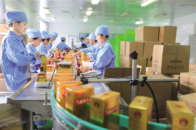 10月8日,在位于云南腾冲经济技术开发区的云南腾冲东方红制药有限公司,工人在包装保健药酒。国庆假期结束,各地企业开足马力,生产一线一派热火朝天的景象。 (据新华社报道)