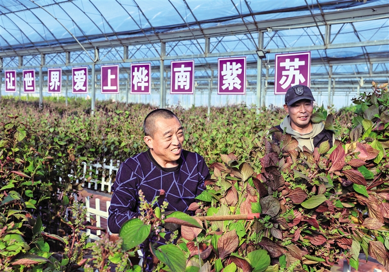 10月12日,在桦南县紫苏种植实验基地的塑料大棚内,工人在收割紫苏。近年来,被誉为“中国紫苏之乡”的黑龙江省桦南县大力发展紫苏产业,以“紫苏规模化种植+科技化生产+专业化营销”产业链布局为抓手,依托本地资源优势,拓展深加工链条,推动紫苏产业高质量发展。目前,桦南县紫苏种植面积基本稳定在10万亩以上,带动紫苏种植户1500户。(据新华社报道)