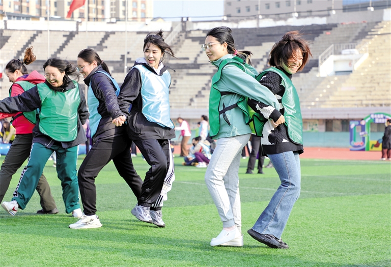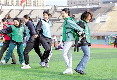 11月8日,选手们在进行夹球跑的比赛。当日,由内蒙古自治区社会体育服务中心、呼和浩特市回民区人民政府主办的“舞出巾帼风采·运动绽放芳华”内蒙古自治区妇女健身趣味运动会在呼和浩特市全民健身服务中心体育场欢乐开赛。运动会以趣味、多样的形式设置项目,设有个人赛和团体赛,700多名参赛者在轻松愉快的氛围中享受运动的魅力。