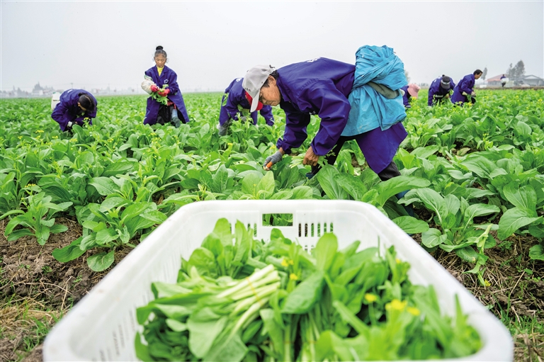 11月16日,村民在常德市安乡县安康乡安兴村“稻稻菜”示范基地采摘蔬菜。近年来,湖南省常德市安乡县推广“早稻+晚稻+蔬菜”轮作种植模式,大力发展蔬菜产业,蔬菜播种面积常年稳定在20万亩以上,其中采用“稻稻菜”模式的产业规模达到5万亩,通过不断提高土地综合利用率,使冬闲田变成增收田。摄影/新华社记者 陈思汗