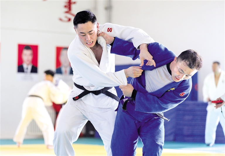 11月27日上午,在内蒙古重竞技运动中心柔道馆内,内蒙古男子柔道队的队员们展开实战对抗训练,为即将到来的第十五届全国运动会柔道项目积分赛和2024年世界柔道大满贯比赛备战。