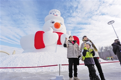 12月9日,游客在哈尔滨太阳岛风景区正门广场与大雪人合影。12月8日,哈尔滨今冬第一个大雪人“雪人先生”在太阳岛风景区落成。大雪人高20米,用雪量4000立方米。