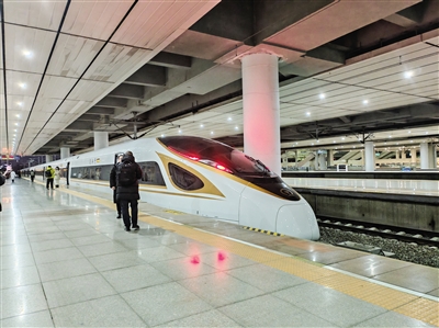 2024年最后一天的清晨,G4798次复兴号动车组缓缓停靠在呼和浩特东站,站台上乘务员们手拿打卡牌和条幅等待发车,集大原高铁首趟列车的旅客们难掩兴奋,纷纷拍照打卡。