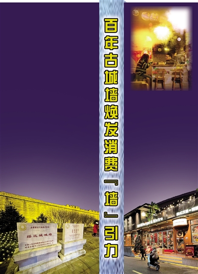 在“凯利空间”餐厅二楼露台,消费者林燕燕和朋友们不停拍照。望着马路对面霓虹灯映照下的古城墙,她难掩兴奋:“我从小就在城墙边长大,这里的变化太大了。古朴的城墙和时髦的商街相映成趣。”