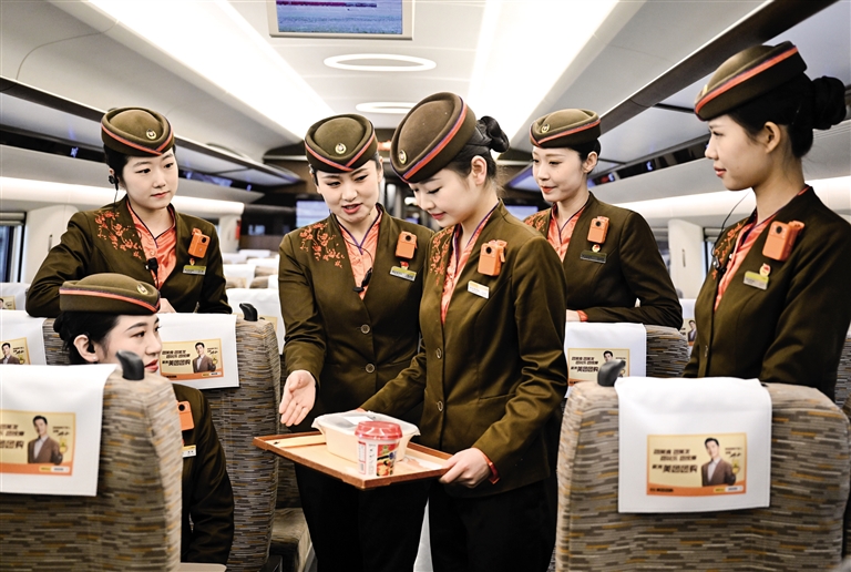 1月12日,列车长和乘务员们进行送餐到座培训。2025年春运将至,武汉客运段“凤舞楚天”乘务组围绕作业流程、重点服务、应急处置等方面进行强化培训,保障春运安全,提升服务质量。