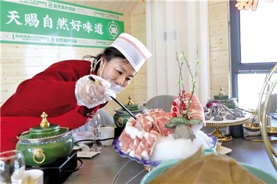 当日,锡林浩特市锡林湖冰面上人头攒动,热闹非凡。随着乌兰牧骑队员们激情四溢的表演,首届草原涮肉节拉开大幕。活动现场,最夺人眼球的莫过于那口独具匠心的“吉祥三宝涮肉锅”。这口直径达1.8米的巨型火锅傲然矗立于户外,黄柿子汤底的鲜甜、麻辣汤底的热烈、清汤汤底的醇厚,三种风味交相辉映。锅中所用的肉品,皆为锡林郭勒盟本地精选的优质牛羊肉,每一片鲜嫩的肉片在沸腾的锅中翻腾跳跃,香气扑鼻,令现场的每一位食客都垂涎欲滴。