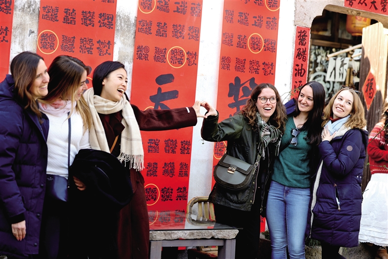1月19日,中外游客在浙江省杭州市小河直街历史文化街区打卡拍照,感受浓浓年味。岁尾深冬,年味渐浓。各地装饰一新,人们购年货、逛集市,在各类活动中喜迎新春。 (据新华社报道)