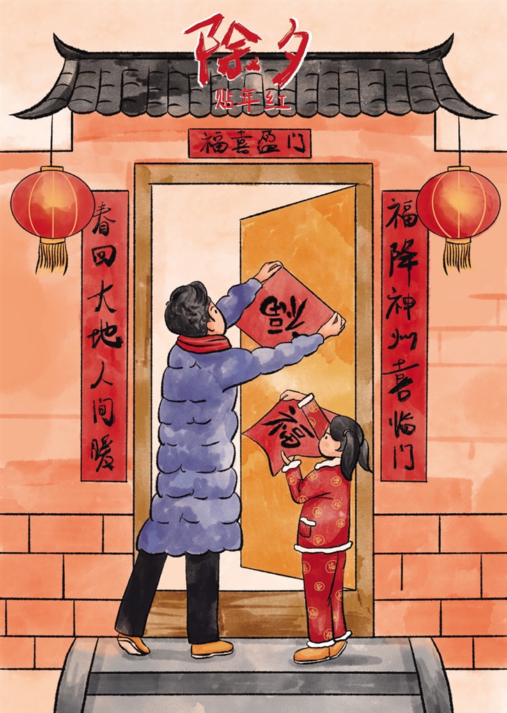除夕当天,我和爸爸刷着糨糊,在楼上楼下贴好了十多副春联。猪圈旁边的“六畜兴旺”,粮仓旁边的“五谷丰登”,红彤彤的颜色里,流淌着乡村人家最朴素的愿望。满眼鲜红的映衬下,在淡淡的墨香里,全家人一起走向新年,满心的期盼,新的一年会像春联一样红火兴旺。