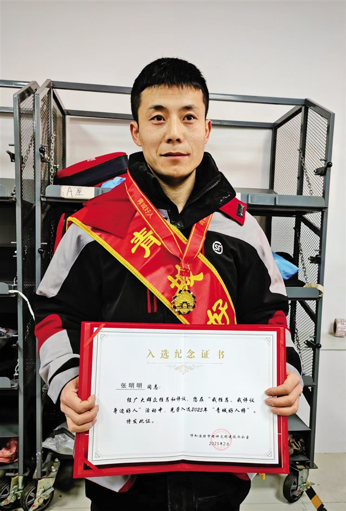 对于快递小哥张明明来说,这是他第二次荣获青城好人荣誉。2023年8月,呼和浩特突降大雨,路面积水严重,数十名群众想过马路却束手无策,张明明用快递三轮车一趟趟搭载群众过马路,被群众亲切地称为雨中的“摆渡人”,并被评为助人为乐青城好人。再次获评青城好人,张明明非常开心。“我儿子刚刚5岁,他知道我灭火的事后,说‘爸爸,你真棒!’”张明明高兴地说,这次救火行动不仅得到了社会的认可,也让家人对他刮目相看,这一份份荣誉将激励着他,继续多做力所能及的好事。