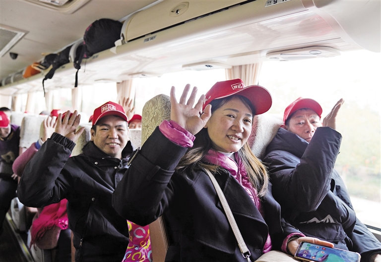2月8日,乘坐免费返岗直通大巴车的人员在出发前挥手致意。当日,云南省昭通市农村劳动力转移就业集中输送欢送仪式在昭阳区举行。3000余名外出务工人员免费乘坐返岗直通大巴车前往福建、广东、江苏等地返岗就业。(据新华社报道)
