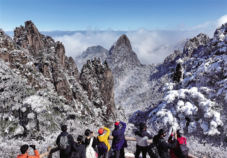 2月24日,游客在安徽省黄山风景区欣赏春雪。