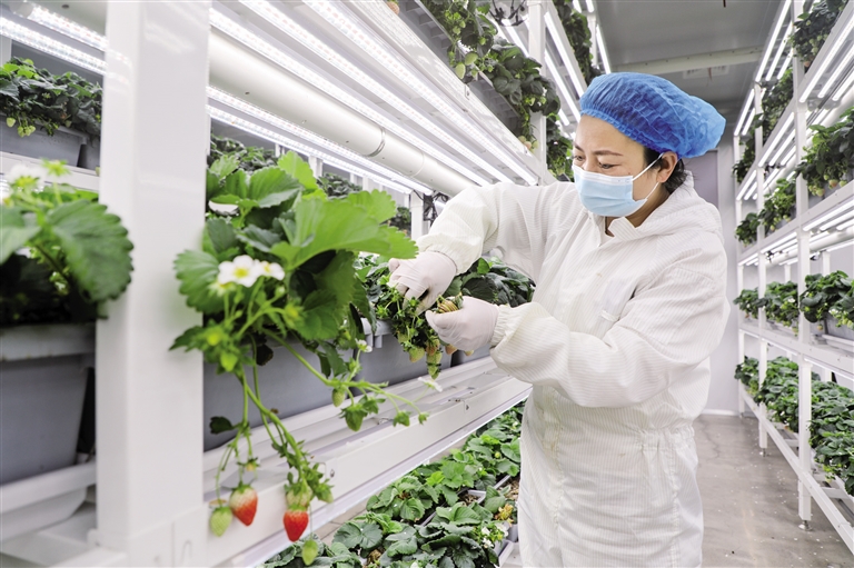 在一层层“货架”上,各类蔬菜长势喜人。种菜不用土,菜苗都住“上下铺”,这里没有阳光,却依然能打造出适宜植物生长的种养环境。与传统瓜果蔬菜大棚相比,走进产业园,仿佛置身一座巨大的“植物工厂”,内部空间开阔、设施整齐。